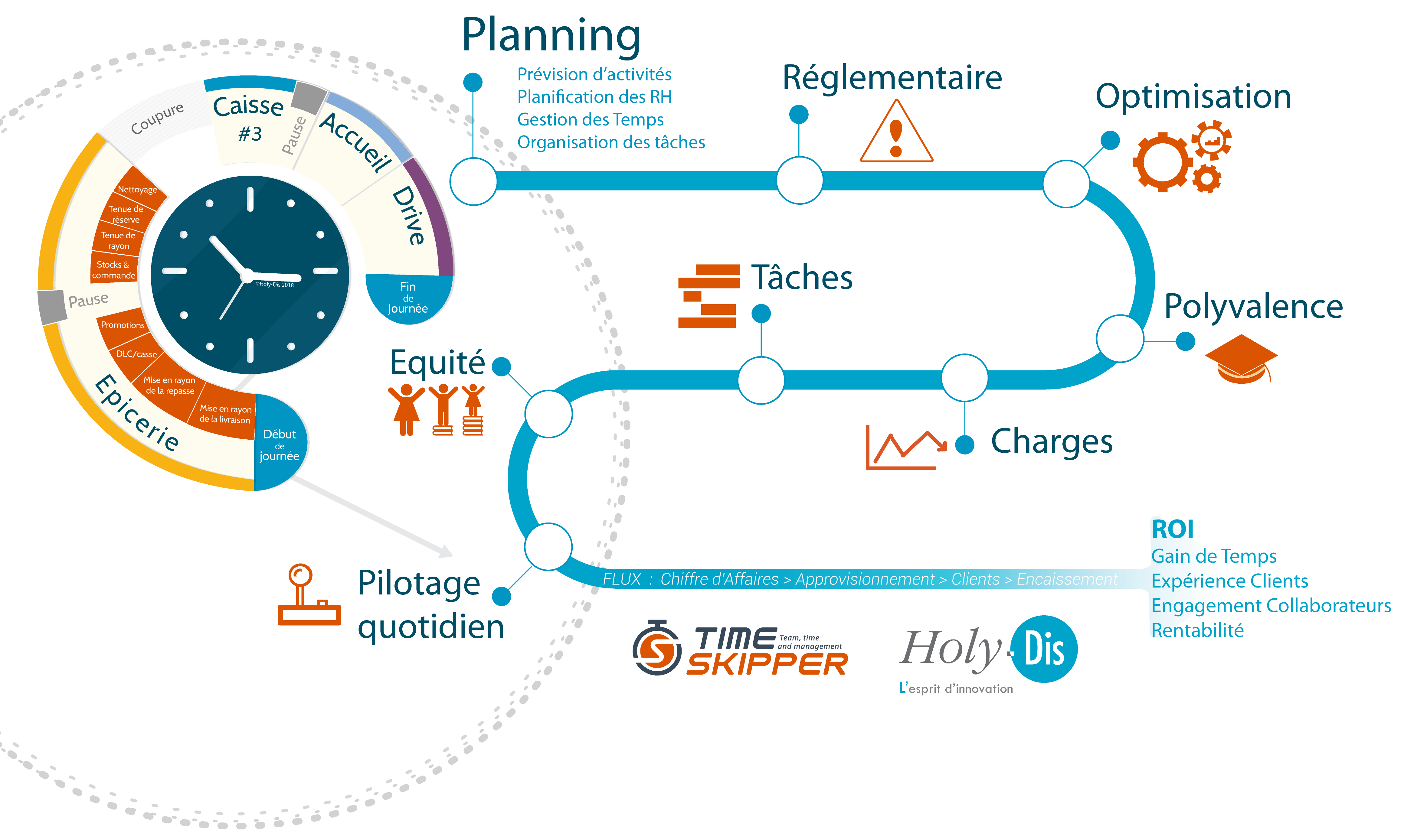 Pour répondre aux attentes du secteur du Retail, Holy-Dis, spécialiste français de la Modélisation, Planification RH et Gestion des Temps signe un partenariat de distribution exclusif avec TimeSkipper, plateforme de pilotage quotidien des activités du point de vente pour la distribution alimentaire et spécialisée. Complémentaire aux solutions de Holy-Dis, TimeSkipper renforce la performance managériale du point de vente en les aidant à mieux piloter les nombreuses tâches des équipes au quotidien.